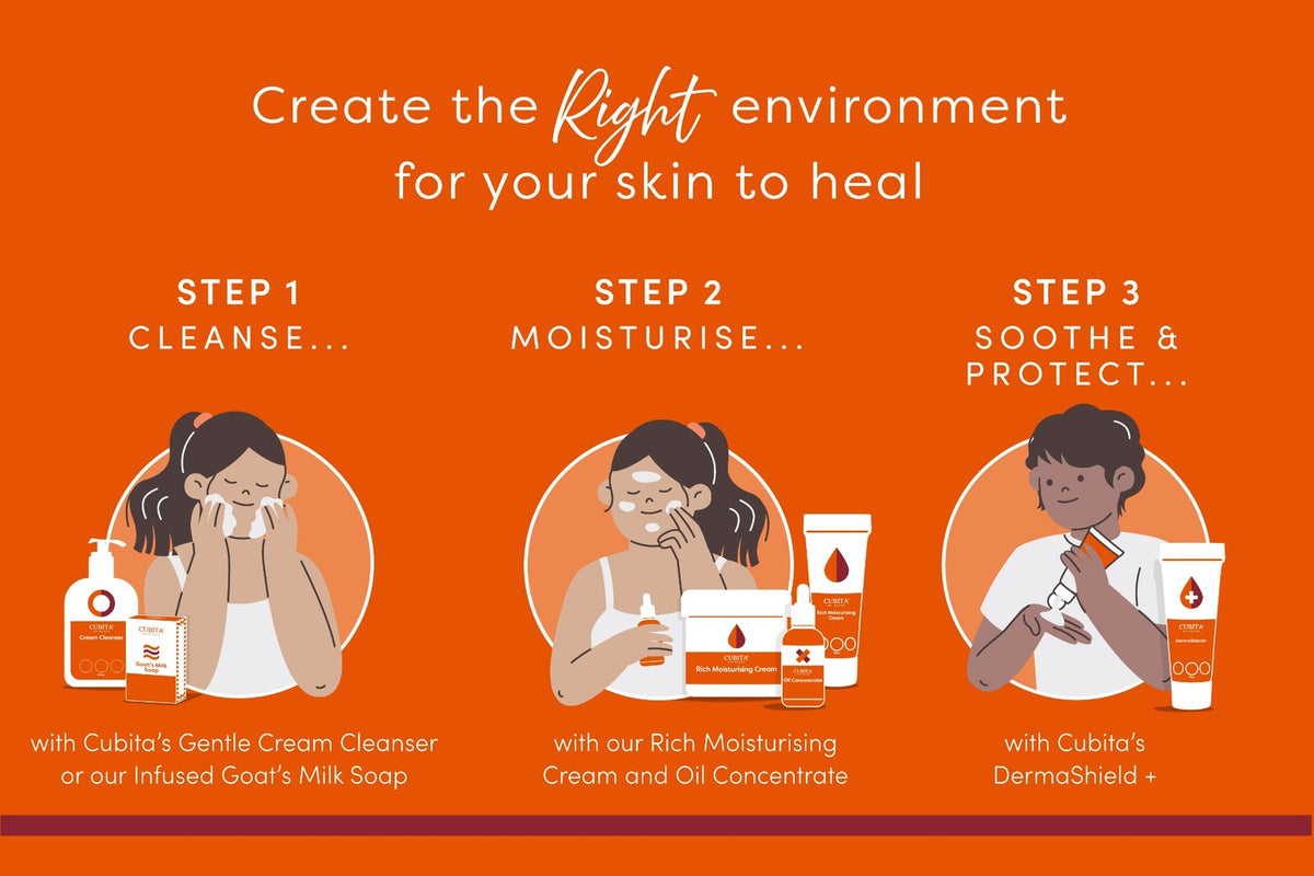 Cleanse, moisturise and soothe. We recommend Cleansing the body with the Oil Infused Goats Milk Soap, the face, sensitive parts and the hands with the Gentle Cream Cleanser. Follow that with the Moisturising cream as frequently as possible during the day, with or without the Oil Concentrate. Apply Dermashield + after moisturising or on its own as often as possible.